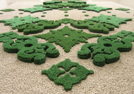 Dans Simili, non seulement détourne-t-elle les motifs d'un carreau pour simuler un jardin à la française mais ce dernier résulte d'un gauchissement d'esthétiques quasi incompatibles qui le dé-nature. Elle crée une composition en expansion et une ornementation inspirée des courbes et contre-courbes d'une nature dynamique en nette contradiction avec l'esthétique classique du jardin français. De plus, comme dans Feu d'Artifice, il s'agit d'une nature essentiellement factice, décorative et inoffensive. Un ersatz de nature qui pointe via l'ornement une culture de faux décors, d'odeurs et de saveurs artificielles, un besoin de faux-semblants, une esthétique du simulacre.